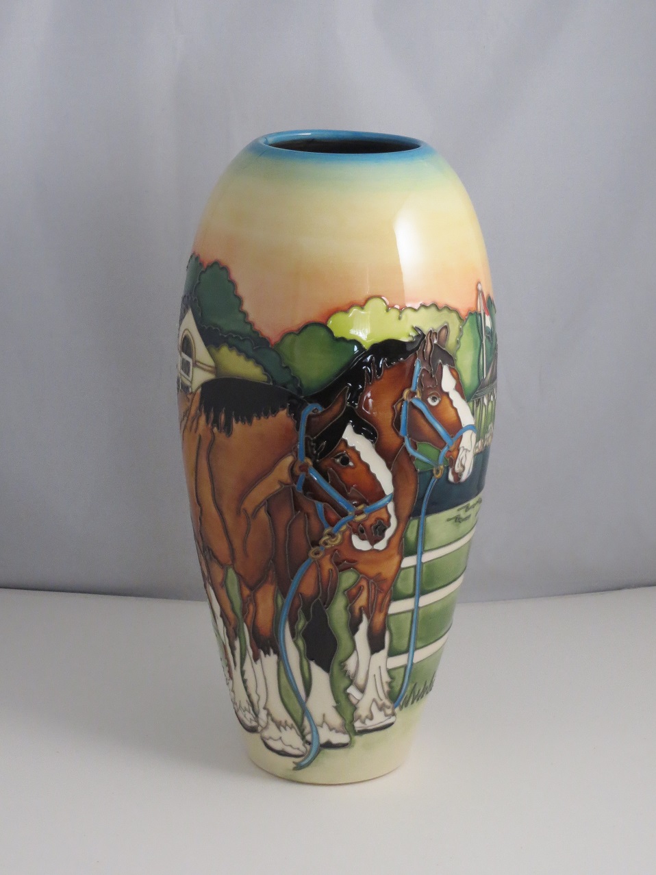 This exquisite equestrian vase was beautifully designed by the premier ceramic artist Kerry Goodwin as part of an exclusive Limited Edition series of just 50 pieces produced within the Countryside Collection. This vase depicts the shire horses in all their finery at the local Showgrounds.